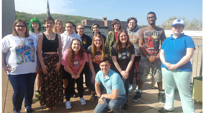 Featured Image: Senior literary arts majors pose for a picture with department director, Paul Walsh (kneeling front center), on the school’s Roof Study Garden.