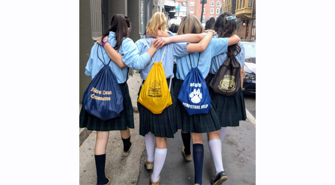 Our Lady of Perpetual Help School students walk through the city streets and into summer as one community. Their draw-string bags show their support not only of their elementary Alma-mater, but also of their future high schools and their township. L-R: Notre Dame Crusaders, Bethlehem Township Softball, Our Lady of Perpetual Help Cougars, Bethlehem Catholic Golden Hawks.