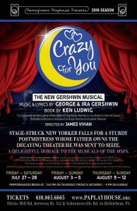 When stage-struck Bobby Child is sent to investigate a defaulted mortgage, he falls for Polly Baker, a sweet and sturdy postmistress, whose father owns the decaying theater he has been sent to seize. With a light-hearted script and collection of beloved tunes of George and Ira Gershwin, Crazy for You is a delightful homage to those optimistic musicals of the 1930s.