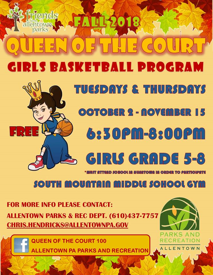 The Allentown Department of Parks & Recreation’s fall Queen of the Court basketball program is a free seven week basketball fundamentals program offered to girls in fifth through eighth grade that attend school in Allentown.