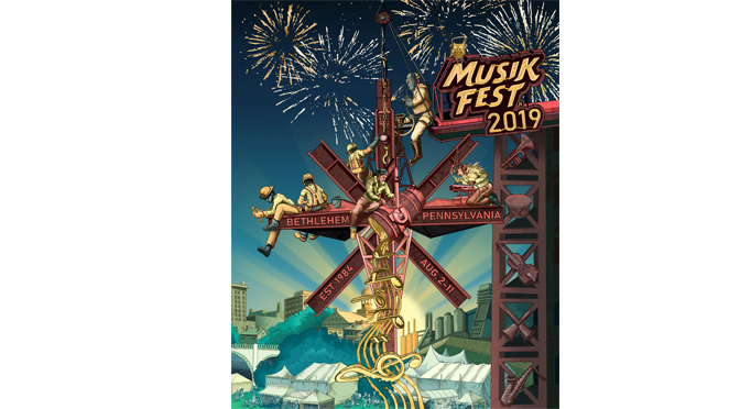 BETHLEHEM, PA–Representing the history and legacy of Bethlehem Steel, as well as the men and women who not only built the city but some of the nation’s most notable landmarks, the 2019 Musikfest poster is a convergence of past and present. With iconic imagery like Musikfest’s tents, SteelStacks and instruments filling the frame, the focus of the dynamic work is steelworkers creating a Moravian star amidst a display of fireworks.