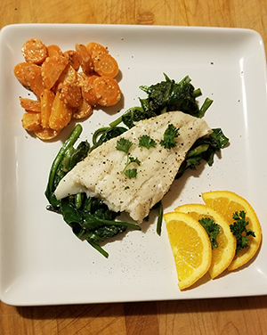 Warm 2 T. olive oil and 2 T butter in medium skillet. After a few minutes add 1 T. chopped garlic and sauté for a few mins until fragrant. Add in Chard and give a quick stir to coat the leaves. Check doneness of carrots, drain and top with 3 T. butter & 2 T. Dijon mustard, cover to allow butter to melt. Check fish for flakiness. When ready, turn off oven and let baking dish sit in oven to cool slightly, while veggies are being plated.