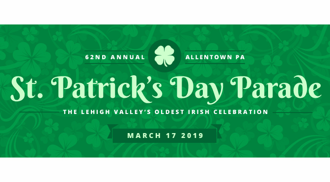 February 2, 2019 (Allentown, PA) The Allentown St. Patrick’s Parade Committee, Inc. announced today the schedule of events surrounding the 62nd Allentown St. Patrick’s Parade presented by Giant Food Stores. The Parade will be held March 17, 2019, departing from the Allentown Fairgrounds at 1:30 pm. The Parade events will kick off Saturday, February 17, 2019 at the annual Fundraiser event being held at Christopher’s at the Columbian Home located at 1519 Greenleaf Street, Allentown PA.