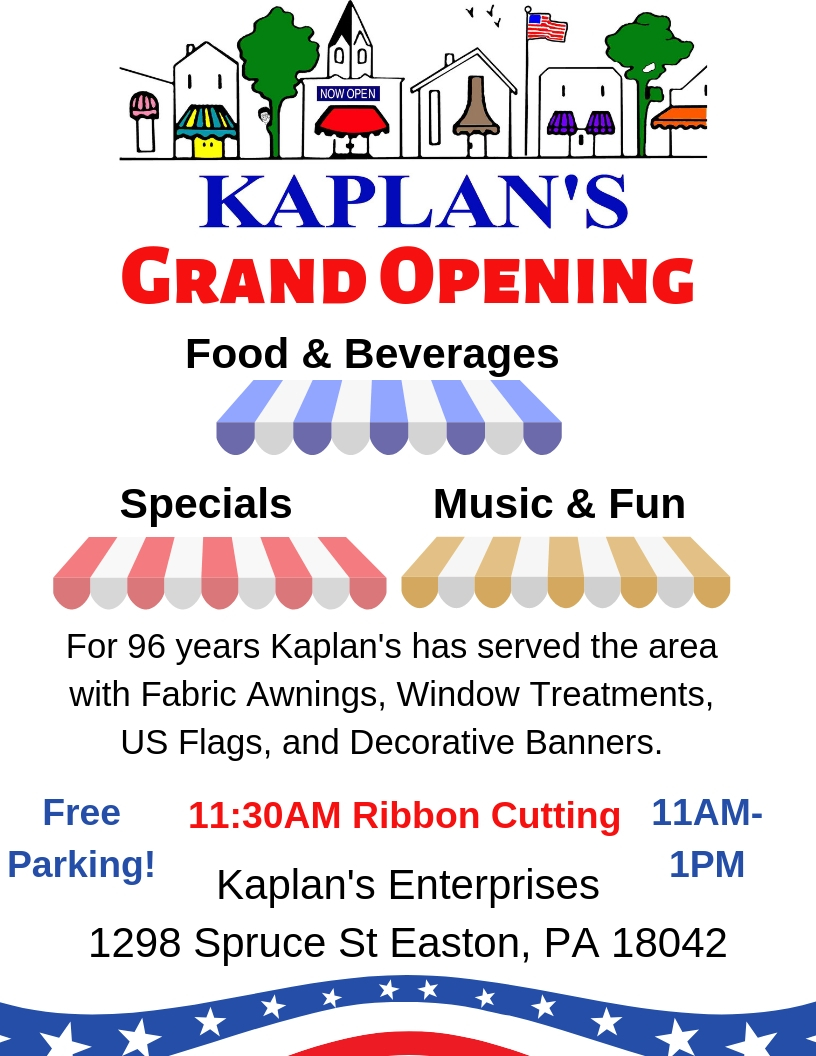 EASTON, Pa.,- Kaplan’s Enterprises, a 96-year-old, family-owned custom awning business, will hold a grand reopening reception on Saturday, April 27, 11 a.m. to 1 p.m., at 1298 Spruce St., Easton, Pennsylvania. A ribbon-cutting ceremony is slated to begin at 11:30 a.m. The event is open to the public.