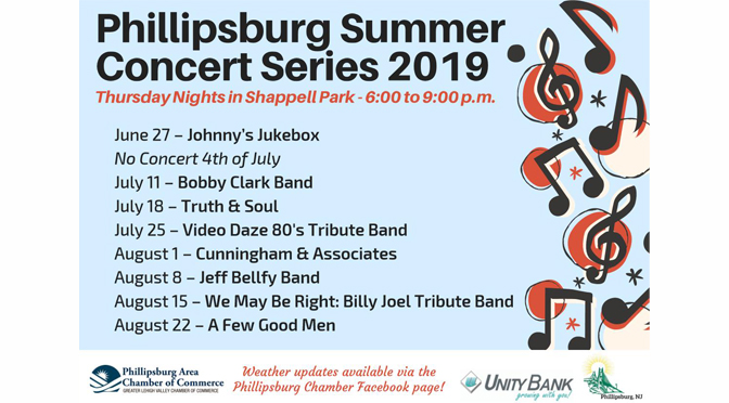 PHILLIPSBURG, NJ – The Phillipsburg Area Chamber of Commerce is proud to present the 2019 Phillipsburg Summer Concert Series. These free concerts are held in Shappell Park (353 S. Main Street, Phillipsburg) every Thursday night of summer from 6:00-9:00 p.m. These acts draw hundreds of music enthusiasts from all over the surrounding areas and make for a great night full of nonstop fun and entertainment with family, friends, and members of our community.
