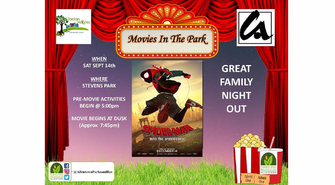 The City of Allentown Department of Parks and Recreation closes out its 2019 Movies in the Park series on Saturday, September 14 with the showing of “Spider-man: Into the Spider-Verse” at Stevens Park, located at 6th and Tilghman streets. The approximately 117-minute movie is rated PG and will begin at dusk (approximately 7:45pm).