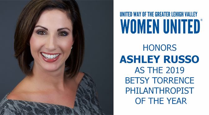 Allentown, PA, September 17, 2019 – United Way of the Greater Lehigh Valley (UWGLV) Women United will honor Ashley Russo with the 2019 Betsy Torrence Philanthropist of the Year Award, the group’s highest honor.