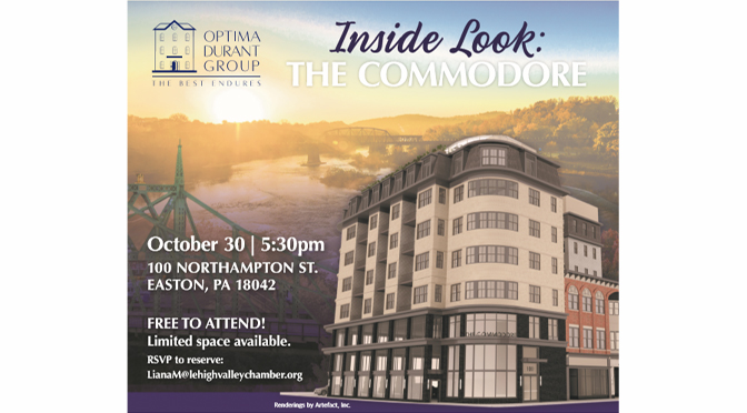 Easton, PA: Wednesday, October 30, 2019- The Commodore Project represents the first true private ground-up construction in nearly 30 years in Easton. Gain an exclusive inside look at the plans for this new residential, commercial, and rooftop restaurant mixed use building of unparalleled sophistication and class. Reserve a spot today to see what The Commodore has to offer! Featured will be a walk through immersive display by Kudu Creative with residential renderings by Artefact Inc. Complimentary refreshments will be provided thanks to various downtown Easton businesses: