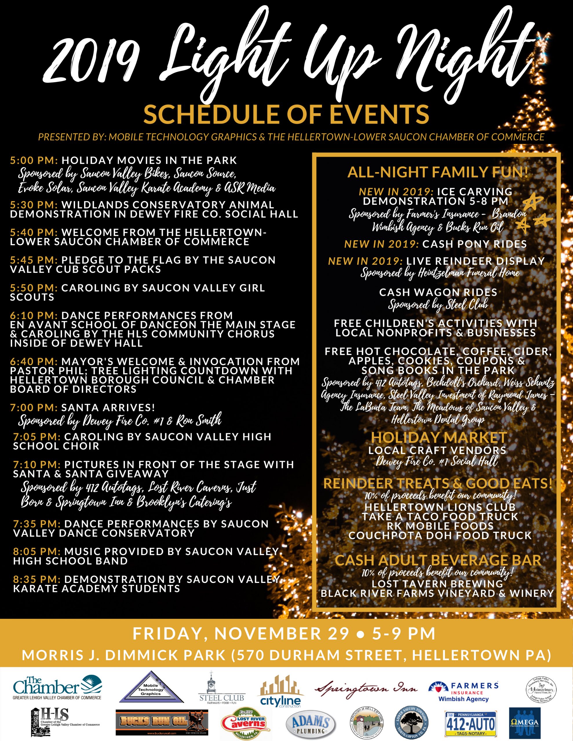 The Hellertown-Lower Saucon Chamber of Commerce and presenting sponsor Mobile Technology Graphics are proud to present Light Up Night on November 29, 2019 from 5-9 PM in the Morris J. Dimmick Park in Hellertown, PA. Join us in kicking off the holiday season with a fun-filled evening that is sure to make Light Up Night bigger and better than ever!