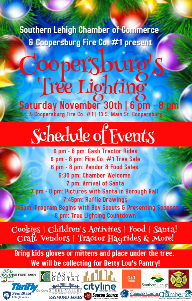On Saturday November 30, the Coopersburg Borough, Coopersburg Fire Company, and Southern Lehigh Chamber of Commerce will come together to kick off the holiday season. Join us at the Coopersburg Fire Company for an evening full of family fun! There will be cash tractor rides from Hausman’s Fruit Farm. The Fire Company will sell trees. Santa will arrive for pictures with kids! There will be raffle baskets, food for purchase, and the official tree lighting ceremony including the local Boy Scouts and Presenting Sponsor CityLine Construction.