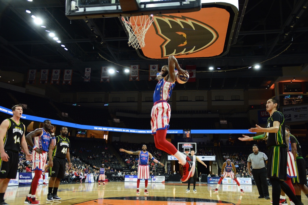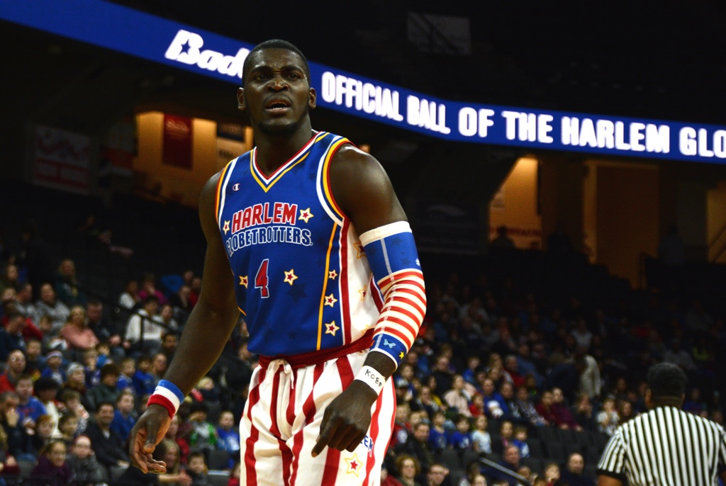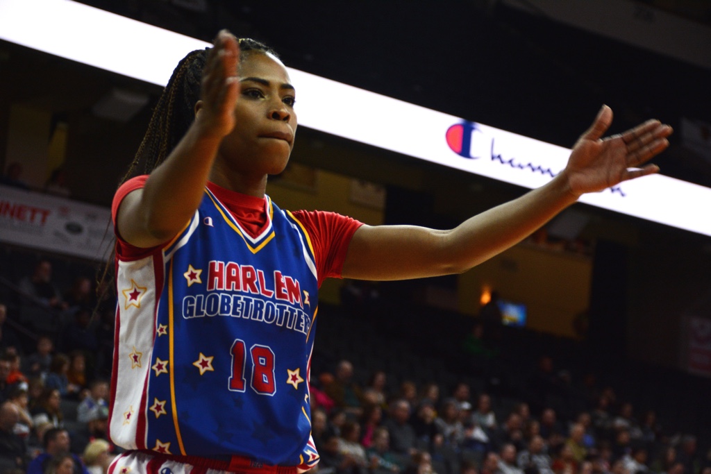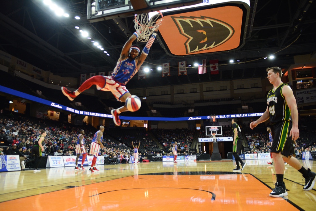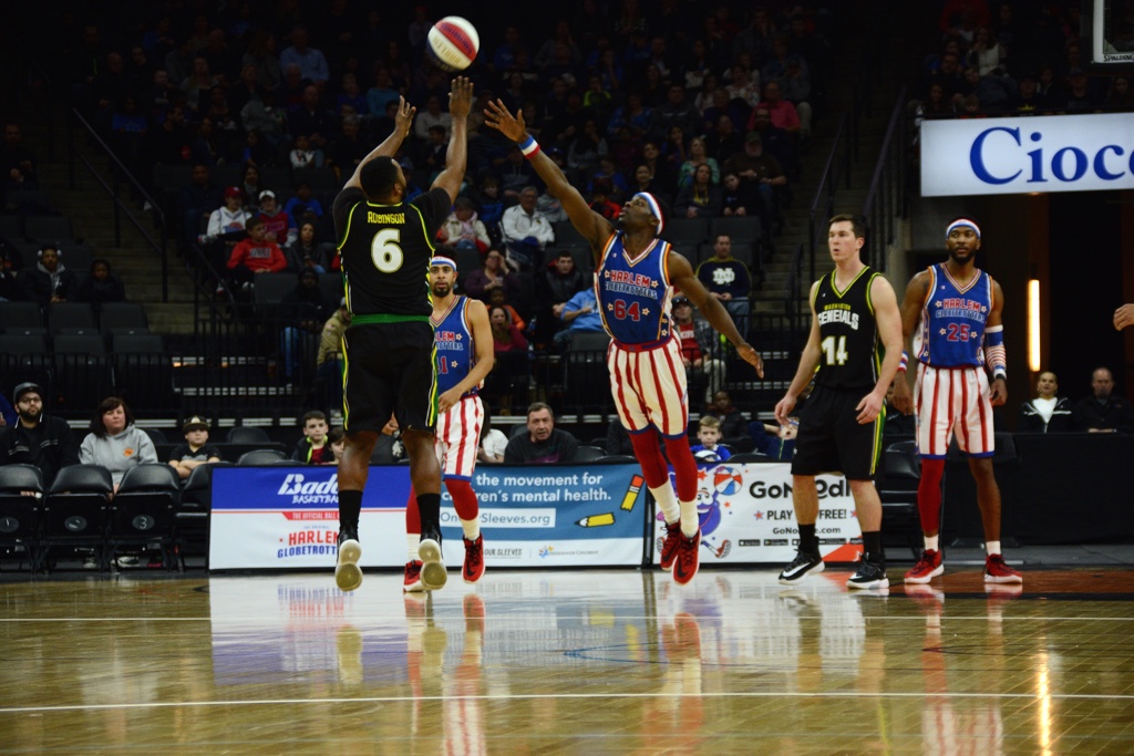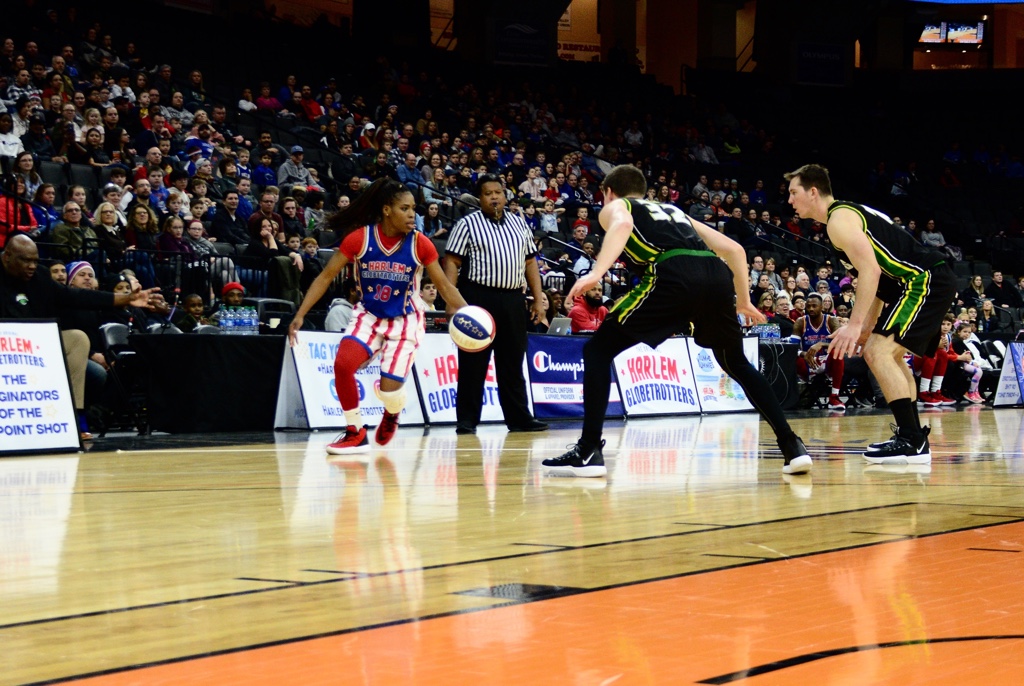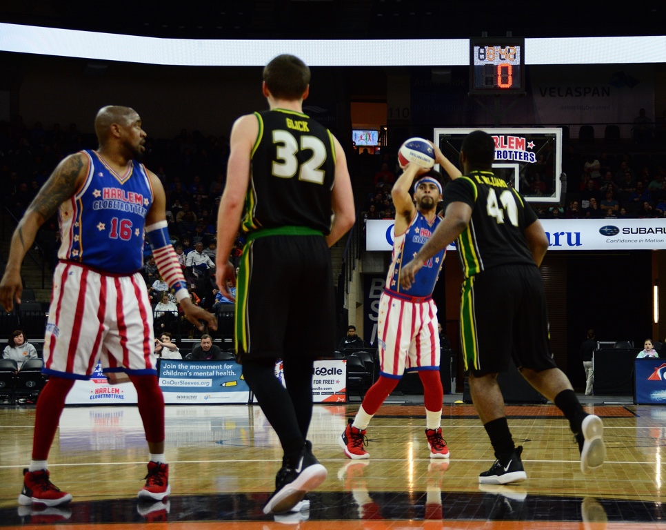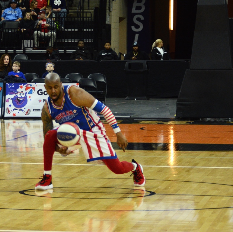 With a little whistling of “Sweet Georgia Brown”, The Harlem Globetrotters took half court and performed their famous circle warm up routine. As the ball passed, each player highlighted their talents which captivated the crowd. The lights went down, and glow in the dark basketballs added to the excitement.